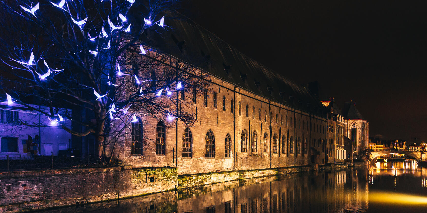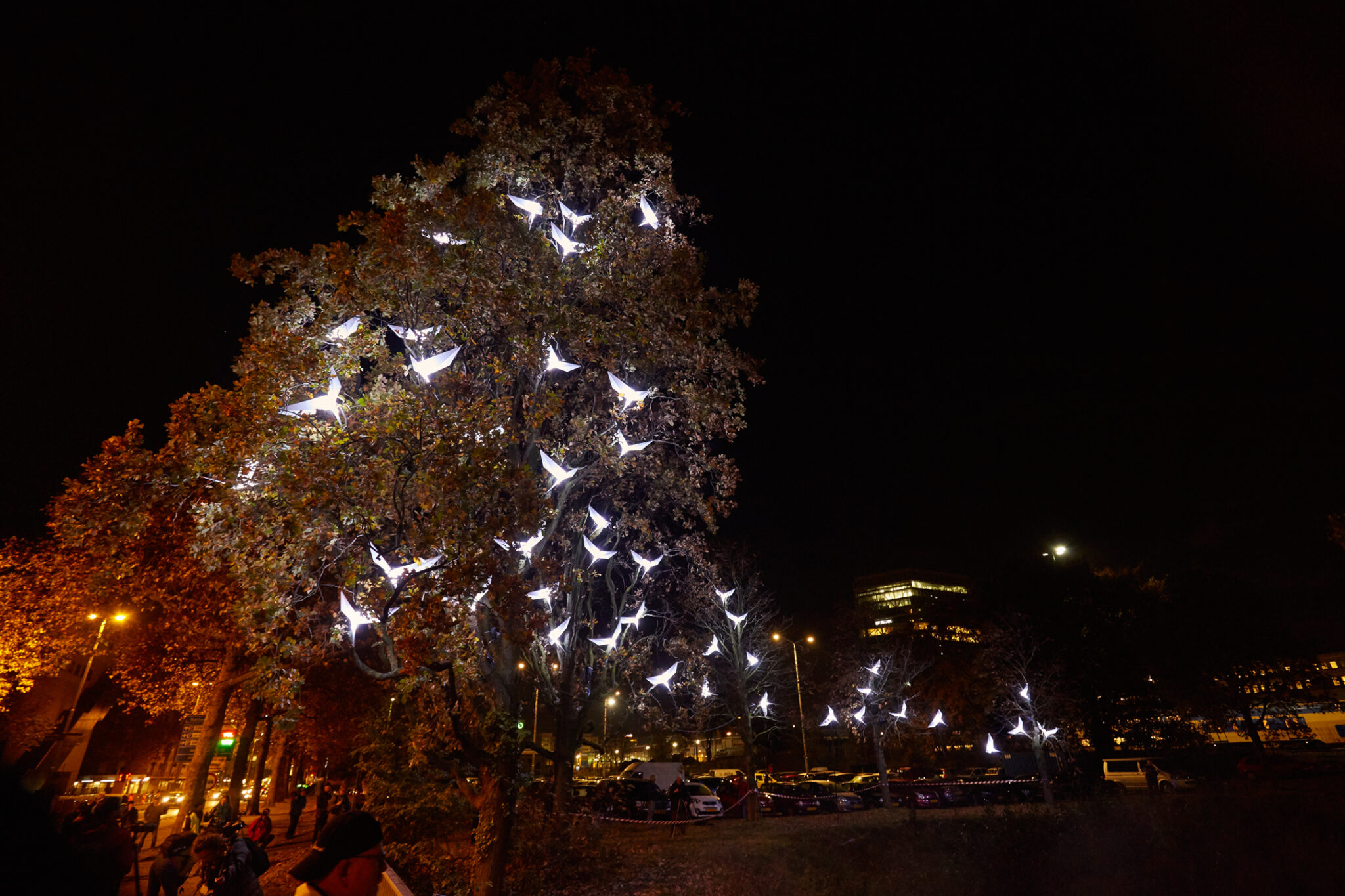 In the trees luminous birds seems to have settle for a while. The setting evokes a moment as if they where just taking off for a flight. The birds, which take up residence in the trees evoke a luminous migration, like if they would resume their journey to move far away. Their shapes are simple and pure forms, like a reminiscent of delicate origami.